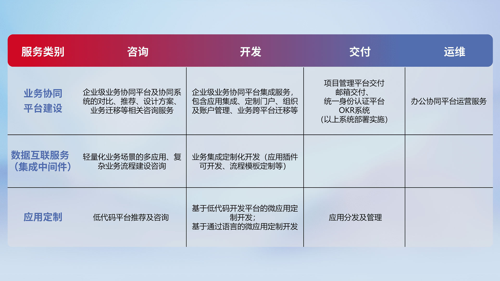 针对钉钉、、企微、、、、IDaas等平台级产品提供产品的规划、、方案、、交付、、定制化开发等服务,,,,实现如统一协同办公、、智能客户服务、、、、混合会议管理、、智能数据查询、、、等业务场景,,,,实现数字化转型。。。