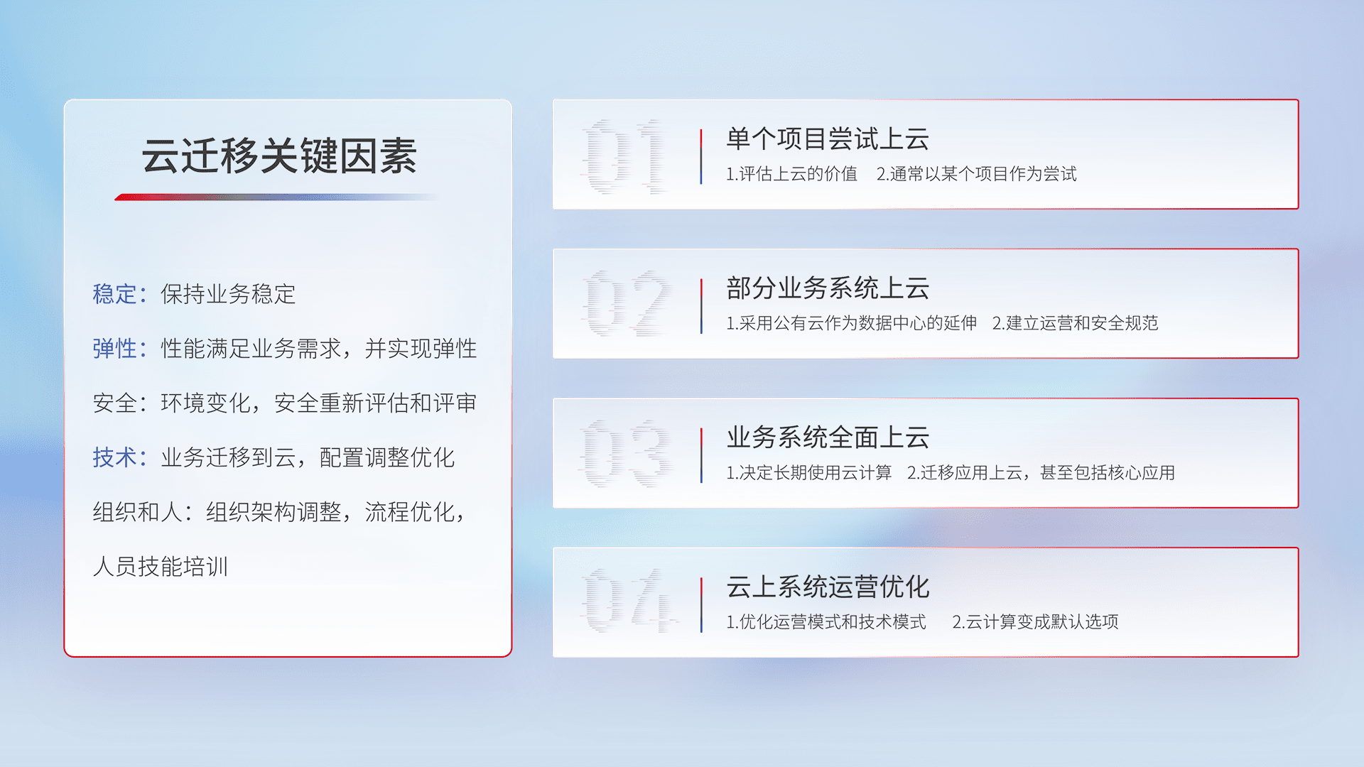 结合实际业务,,,,从规划设计、、云平台选型、、、云原生改造、、、数据迁移、、、、集成交付,,,,迁移全过程为客户识别最佳上云路径,,做好风险识别管理,,设计网络架构、、身份权限、、安全审计合规、、操作审计、、日志审计、、、监控告警策略、、、多站点容灾设计等,,,对云上基础设施进行整体规划,,,提升IT治理水平,,,,以满足弹性、、、高可用、、、高性能的需求。。。