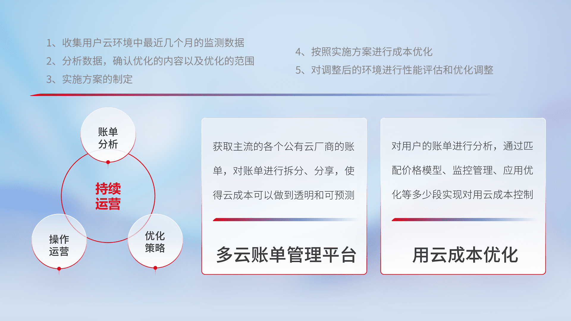 通过多云纳管,,,,以统一的资源数据模型把客户的云资源进行抽象和封装,,进而实现对多云资源的统一操作,,,,保障云资源管理的可靠性、、稳定性与可用性。。量身定制化运维内容,,配置、、开发运维、、、补丁管理、、、、备份、、、、监控、、、认证和访问管理、、、、审计和日常巡检等,,,,保障在用云过程中的可靠度,,稳定度以及高可用率。。。。